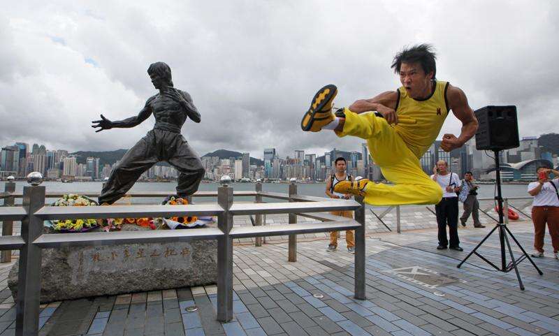 Chinese actor Mei Zhiyong, dressed as the late Hong Kong kung fu star Bruce Lee, performs Saturday in front of a bronze statue of Lee in Hong Kong on the 40th anniversary of his death. Commemorating his death 40 years ago, the Hong Kong government has teamed up with the Bruce Lee Foundation to put together an exhibition to showcase his life, from the famous yellow tracksuit he wore in the movie “Game of Death” to his writings and drawings.