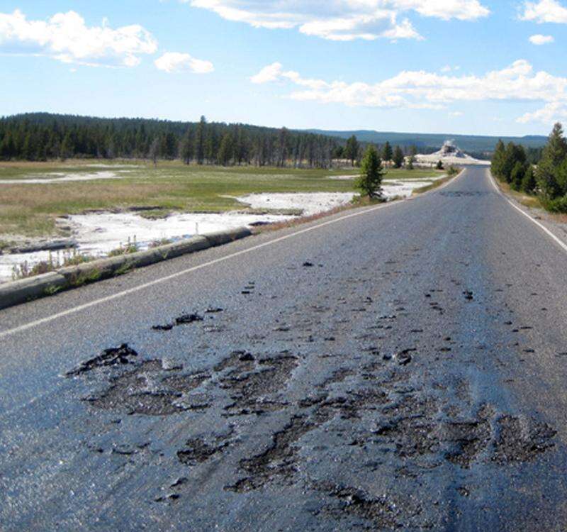 Naturally changing thermal features often damage Yellowstone’s roads and boardwalks. Steaming potholes in asphalt roads and parking lots – marked off by traffic cones – are fairly common curiosities.
